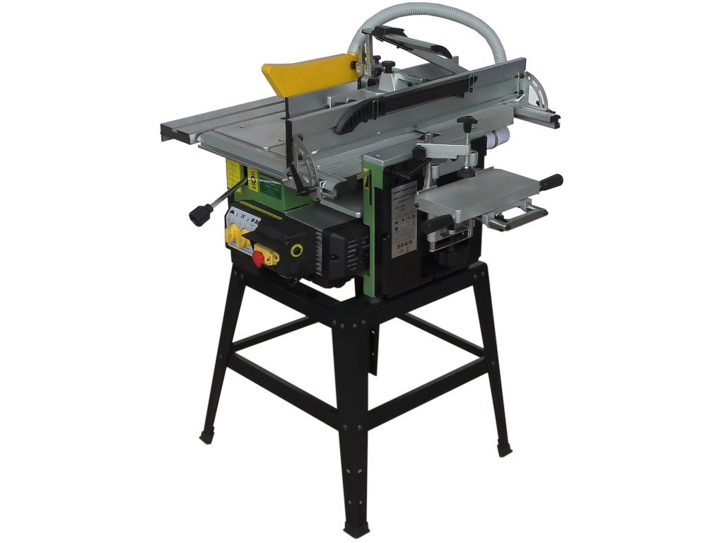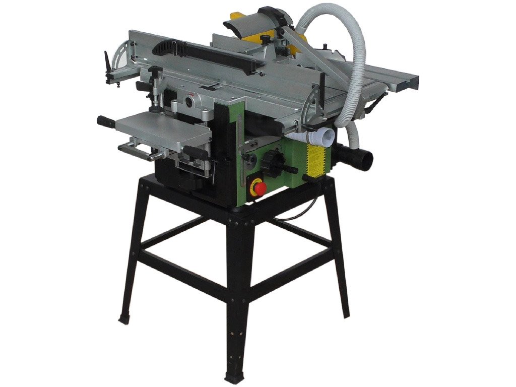 C’est un petit combiné pour le travail du bois, avec piètement inclus, indiqué pour les bricoleurs qui pratiquent l’usinage du bois pour la première fois. Elle peut effectuer 6 opérations différentes. Elle dispose de plans en aluminium, est très compacte et est aux normes CE. Le moteur est monophasé en 220V possédant une puissance de 1100W. Son poids de seulement 47 Kg permet de la transporter très aisément. La machine est livrée avec une lame de scie circulaire et les fers de rabot.Elle est en outre équipée d’un petit arbre de toupie verticale (diam.20) qui peut supporter des petites fraises universelles (fraises de défonceuse) de diamètre 6-8-10 grâce aux bagues d’adaptation fournies avec la machine. La mortaiseuse peut supporter des mèches jusqu’à 13 mm