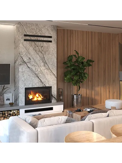 Insert à bois en fonte haute puissance 16,3 kW, conçu pour chauffer jusqu’à 163 m². Rendement élevé de 80,4 %, compatible avec bûches de 70 cm. Fabrication européenne, installation encastrée.