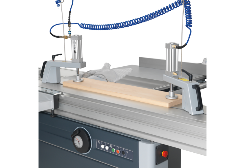 Serrage pratique des pièces avec un maximum de flexibilité. Utilisable sur toute scie à format et toupies avec chariot coulissant. Facile à installer ultérieurement grâce au support magnétique, peut être combiné avec le 430-139 ou le 430-140.