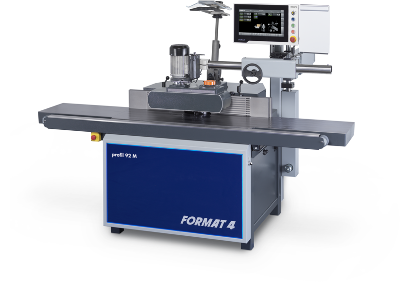 La nouvelle toupie profil 92 M e-motion est le modèle premium de Format4 pour un confort d’utilisation maximal et garantit une efficacité absolue grâce au temps de préparation minimisé. L’arbre de toupie dispose d’un accouplement HSK 63F pour un système de changement d’outil rapide à serrage pneumatique. La plage d’inclinaison de ± 46 permet une diversité d’utilisations sans limites. La commande intuitive e-motion avec son écran tactile 15“ permet un réglage précis de la vitesse de rotation. de hauteur et inclinaison de l’arbre, du guide et même de l’ouverture de table. La mémorisation des outils, des arbres et des programmes de fraisages permet une répétabilité parfaite et un temps de préparation minimisé.